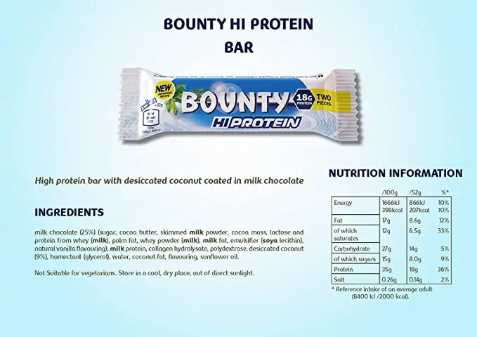 Each 52 gram Official Bounty Protein Bar now contains more coconut flakes and a smoother milk chocolate coating to make the flavour and texture identical to a real Bounty. Spilt into two bite sized pieces per packet you get over 18grams of whey protein concentrate for muscle building and recovery.